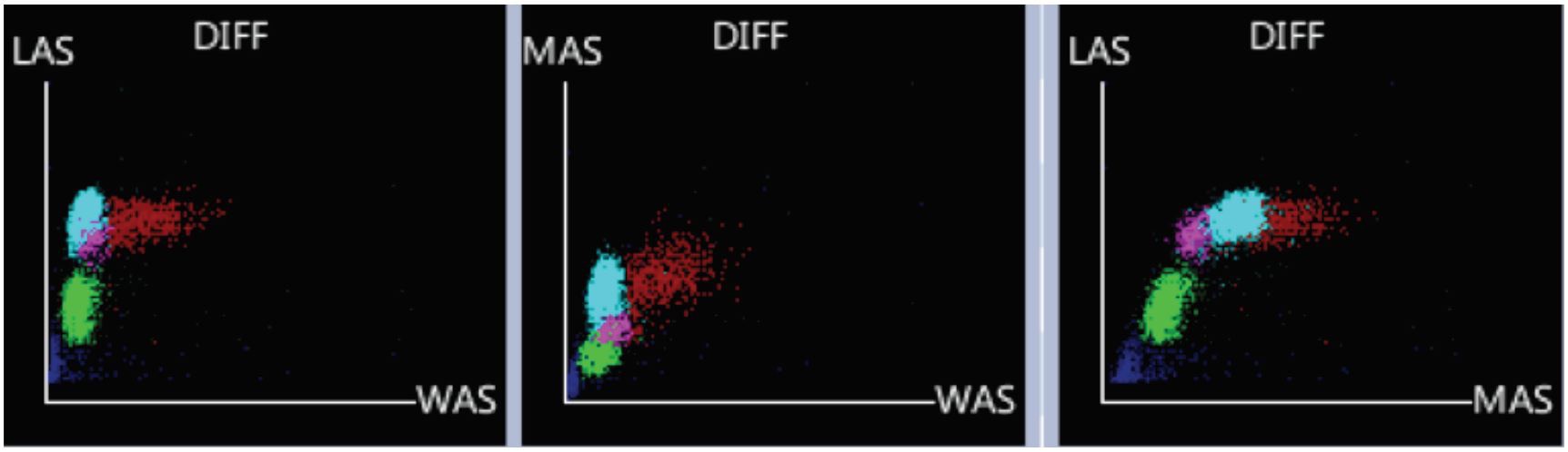 Розсіювання світла під трьома кутами дозволяє виявити об’єм клітини, складність та зернистість.