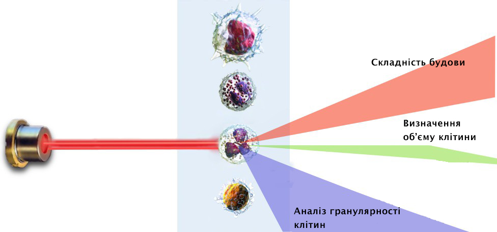 Інтенсивність розсіяного світла пропорційна розміру та внутрішньоклітинній щільності клітини крові. Близьке світло під малим кутом – показник розміру клітин, розсіяне світло під високим кутом – показник внутрішньоклітинної щільності (розмір і щільність ядра). Розсіяне світло вловлює оптичний датчик, який перетворює його в електричні імпульси. На основі цих імпульсів можна графічно тривимірно відобразити розподіл значень (точкова діаграма).