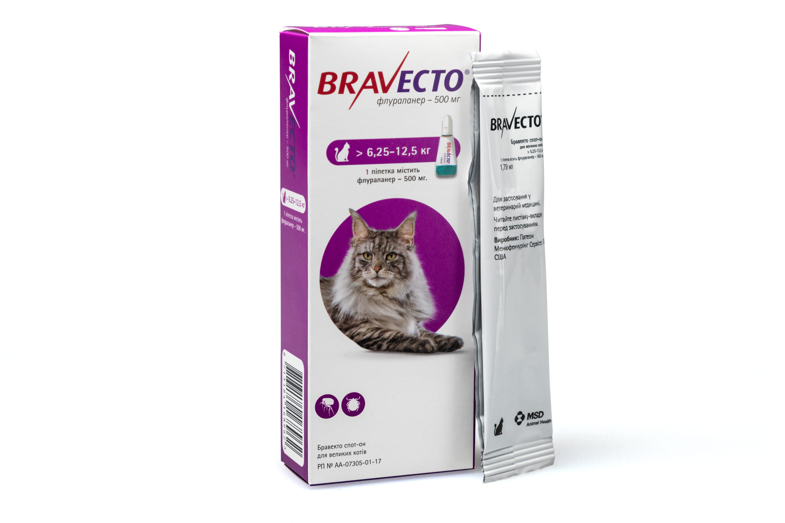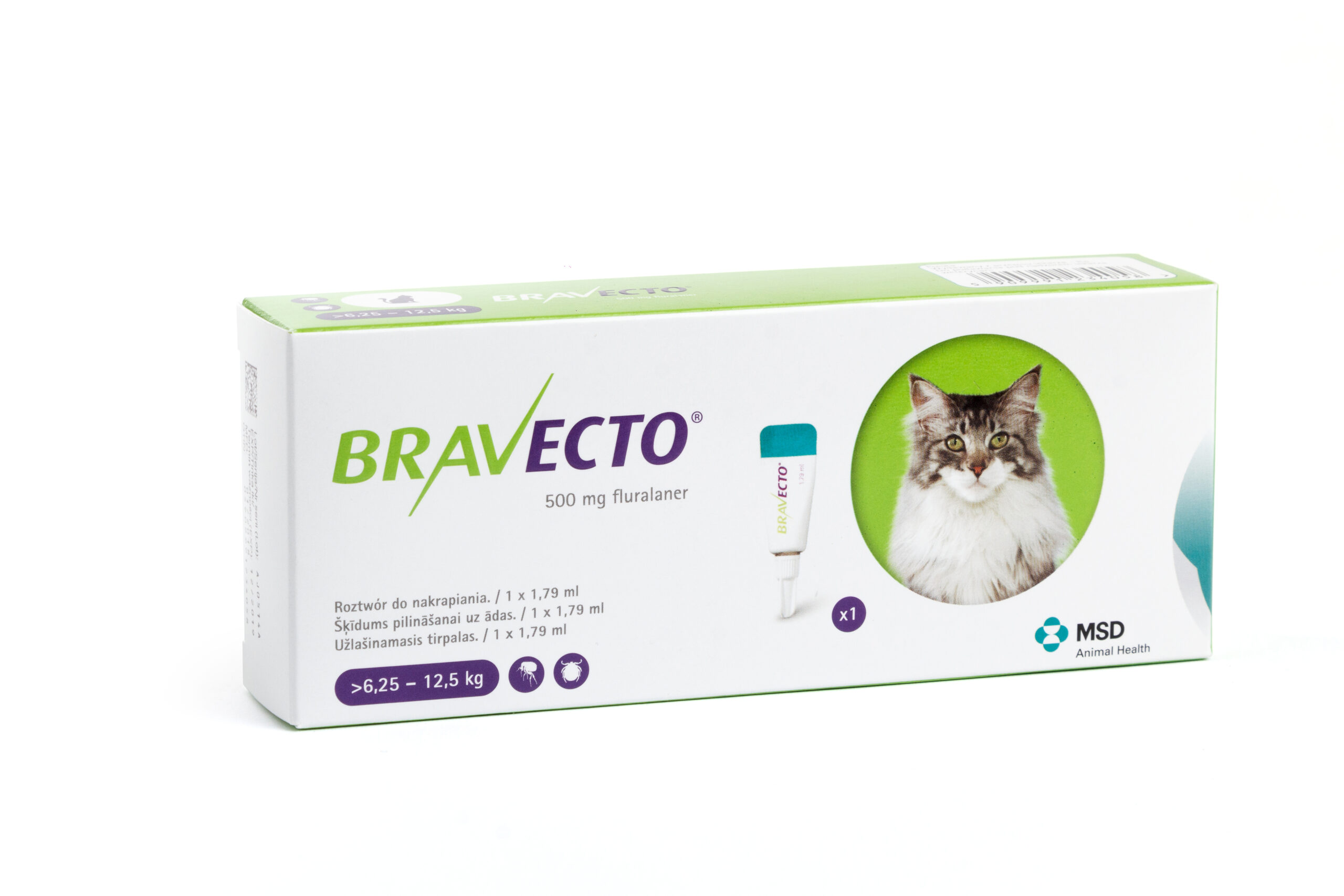 Симптомів передозування не спостерігали при застосуванні препарату Бравекто® спот-он кошенятам віком 11-13 тижнів і масою тіла 1,2-1,5 кг у дозі, що у 5 разів перевищувала максимально рекомендовану дозу (93 мг, 279 мг та 465 мг флураланеру/ кг маси тіла) при 3-х разовому застосуванні з коротшими від рекомендованих інтервалами (8 тижнів). При пероральному застосуванні препарату котам у максимально рекомендованій дозі 93 мг флураланеру/кг маси тіла іноді спостерігають салівацію, кашель або блювоту відразу після застосування.
